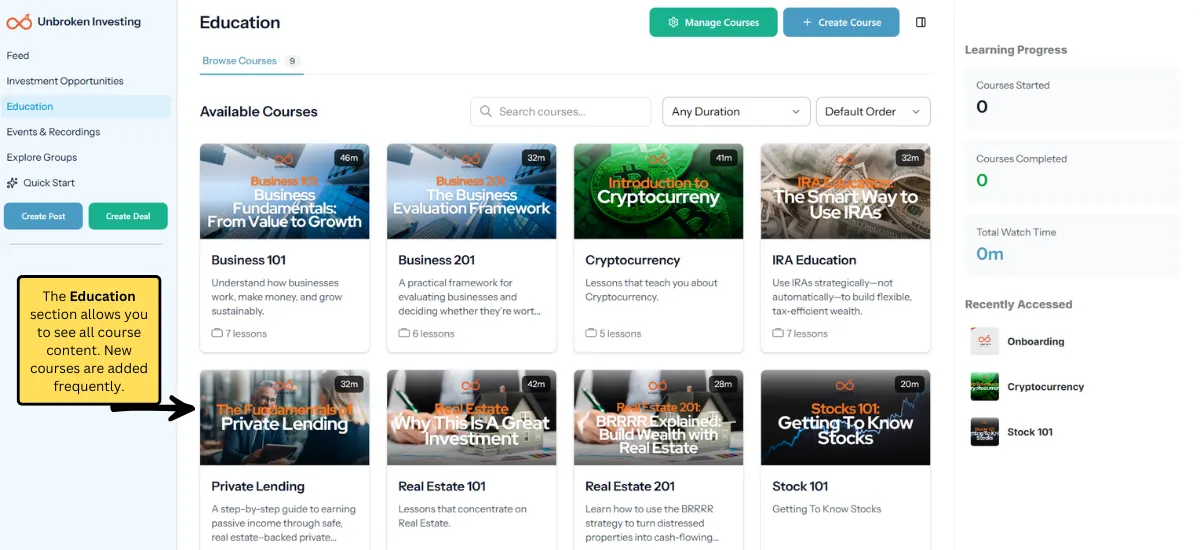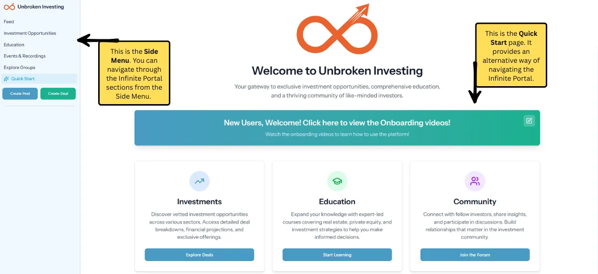 In the next few minutes, you’ll learn how Unbroken Investing works, what makes it different, and how to take the next best step for your situation. Start by getting familiar with the portal layout below.